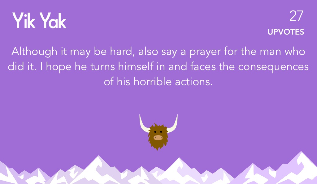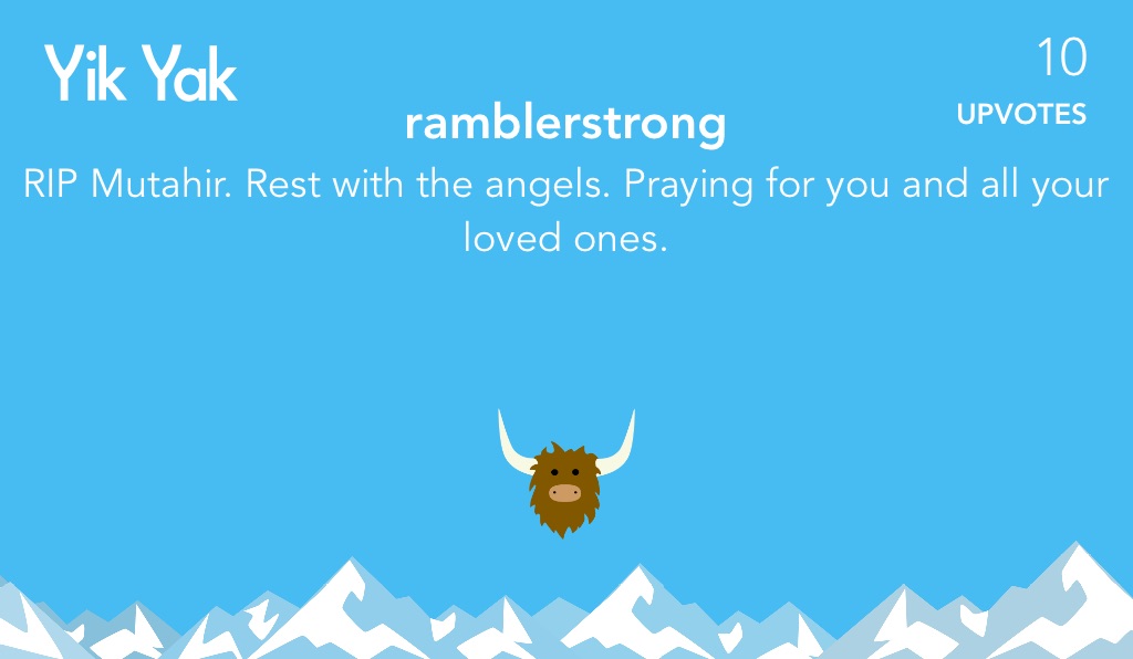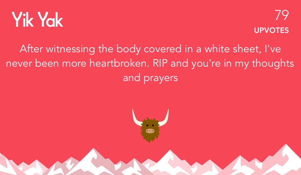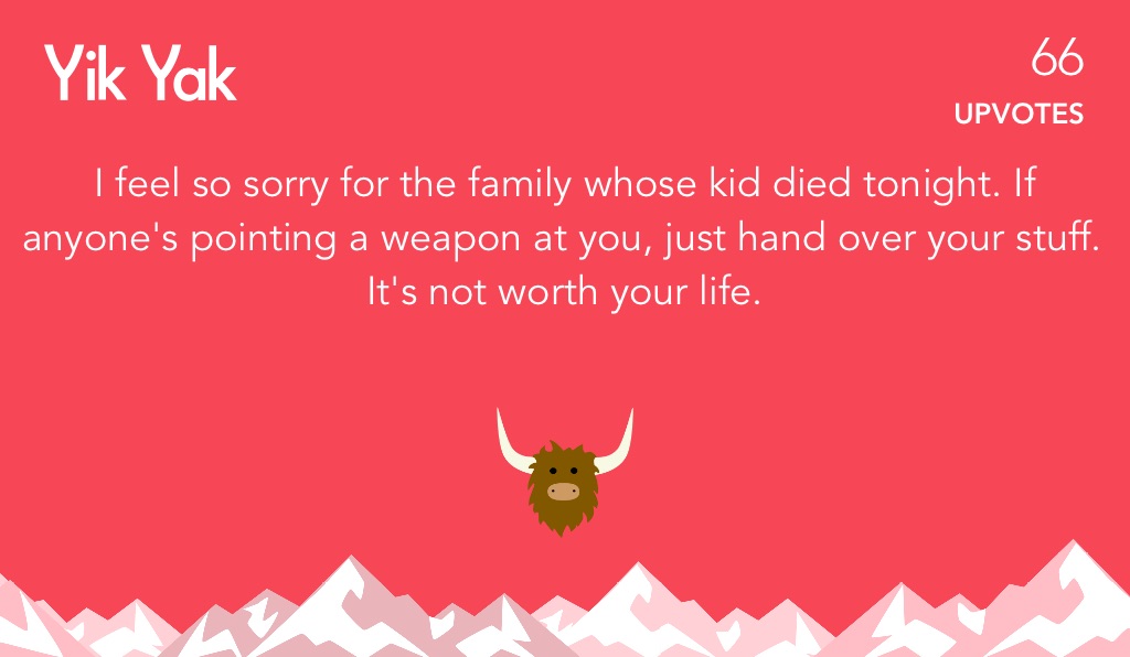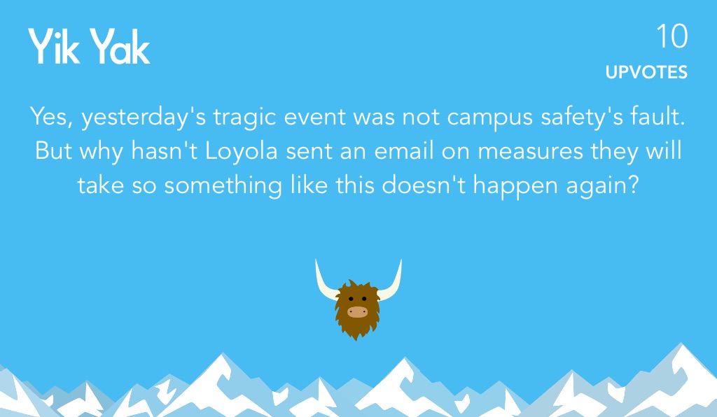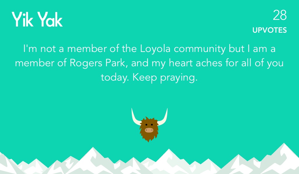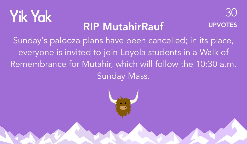 On Friday night 12/04/14 a Loyola student, Mutahir Rauf, was shot in an attempted robbery. This is how the YikYak-community responded in the first 24 hours: